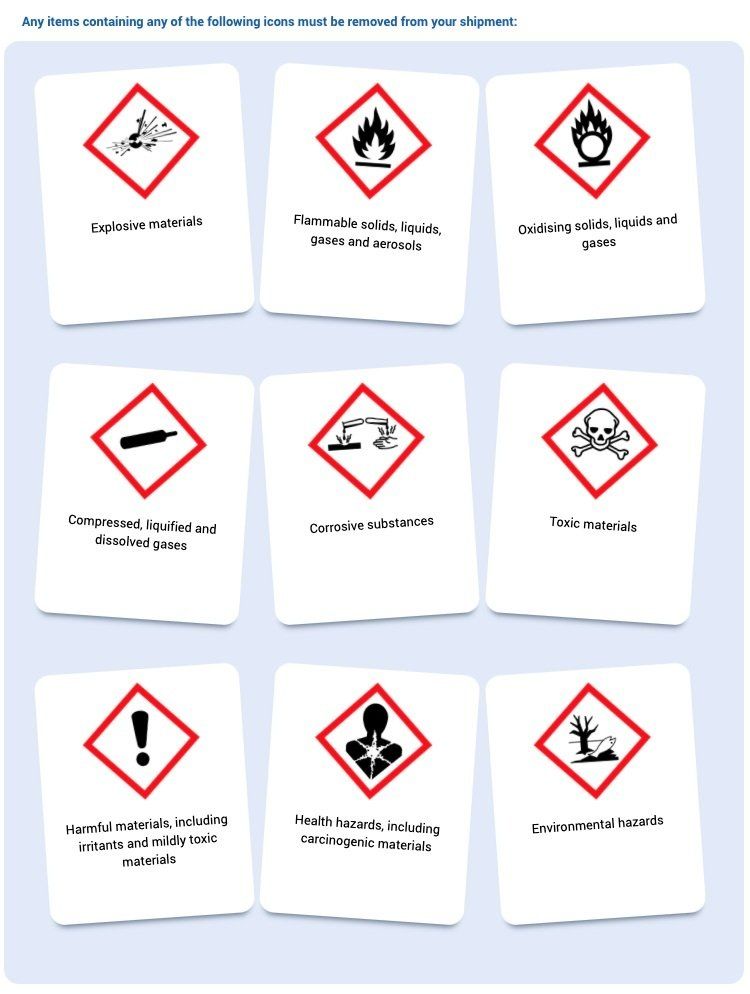 The following items are Dangerous and Hazardous goods which should not be shipped under any circumstances. If found within your consignment, items will be destroyed and you will be fined £100.